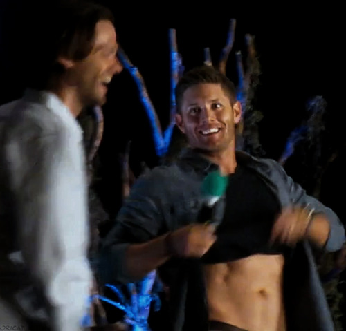 Meanwhile, TPTB made sure to save the controversial question about Castiel's confession of his love for Dean (Ackles' character on Supernatural) to occur at the end of the J2 Gold panel. This strategic placement, followed by Jared spewing a bunch of homophobic nonsense is then followed by Jensen leaving the stage, supposedly because he was miffed over being "silenced" by Jared's verbosity.